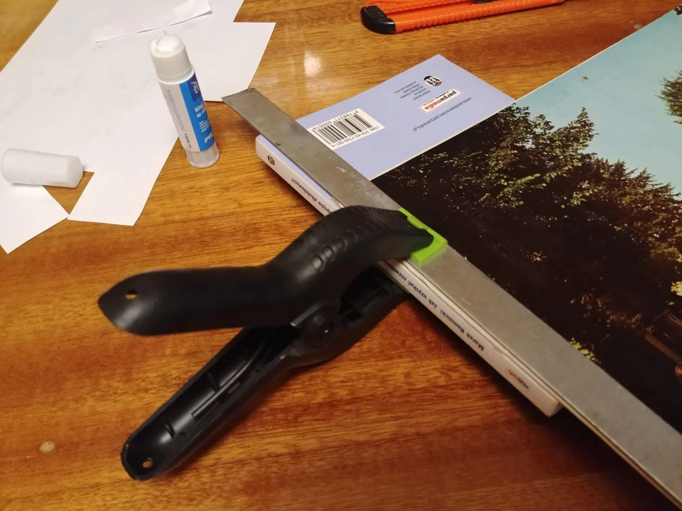 Zadbaj o narzędzia i materiały pracy. Potrzebować będziemy: ostry nóż, mały ścisk lub kilka książek, klej, papier oraz odpowiedniej wielkości kawałek twardego materiału o grubości okładki - w moim wypadku linijka. Ten ostatni element ma szczególne znaczenie. Wkładamy go w miejsce naprawy po zakończeniu klejenia. Uchroni on okładkę od zgniecenia przez stos książek lub ścisk. Jeżeli w waszym przypadku linijka będzie miała nieodpowiednią grubość, warto użyć stosu kartek. Możemy idealnie dobrać grubość przez redukcję lub zwiększenie ich ilości.