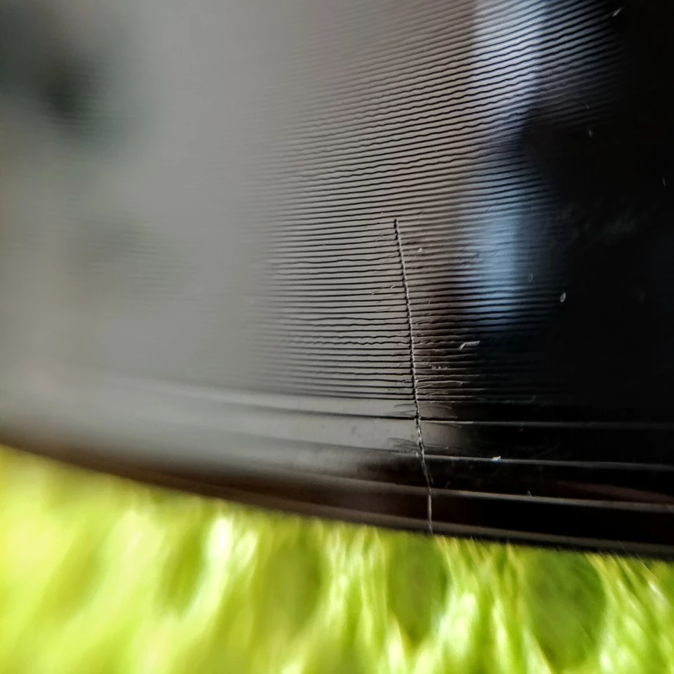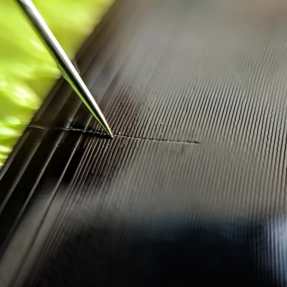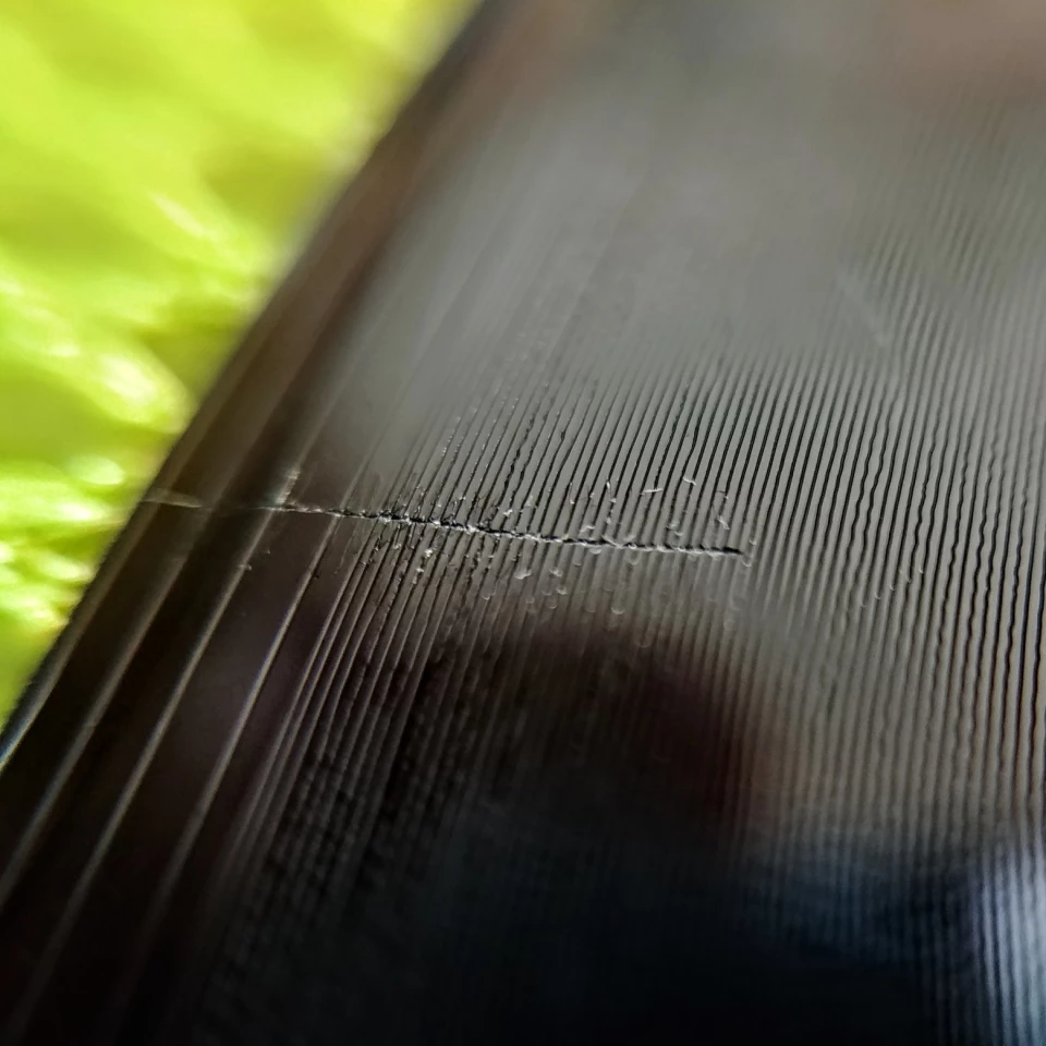 Trzecie zdjęcie zostało wykonane po wstępnym myciu. Rysa zmieniła swój kolor: nie jest już biała, przybrała za to barwę materiału. Zauważalne jest również jej wygładzenie, nie ma już ostrych ścianek.