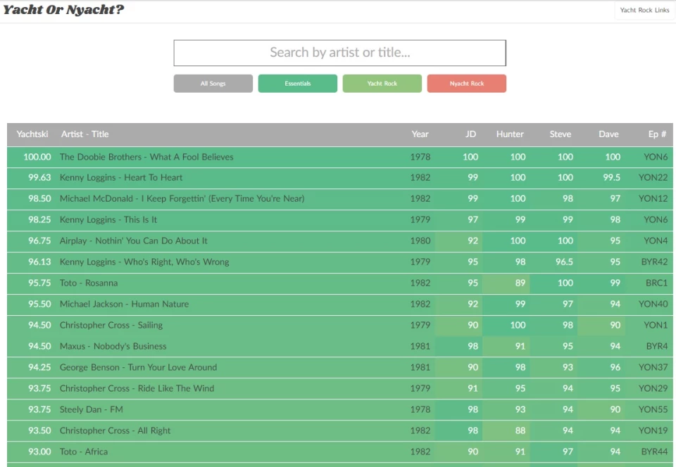 Kilka lat po premierze serialu, jego twórcy założyli także podcast Beyond Yacht Rock, w którym omawiali historię tej muzyki, próbowali opracować jej najważniejsze cechy, a także oceniali stopień jachtowości wybranych piosenek (cykl „Yacht or Nyacht”). Nagle wielu ekspertów muzycznych i dziennikarzy zaczęło się zastanawiać, co powoduje, że dana piosenka jest zakwalifikowana jako yacht rock. Matt Collar z AllMusic podjął się stworzenia charakterystyki takiego wzorcowego utworu: