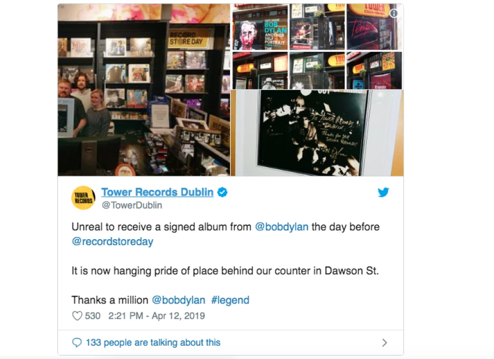 “Dla Tower Records Dublin, dzięki, że wciąż sprzedajecie płyty! – Bob Dylan.”