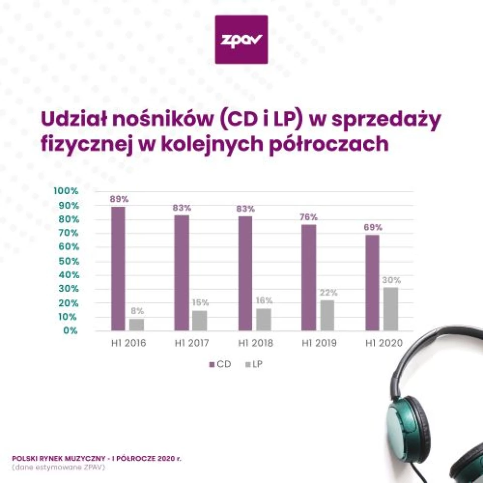 Nie wszystkie jednak nośniki odnotowały spadki. Czy to ze względu na dyskretny urok, niepowtarzalny dźwięk czy też możliwość celebracji odsłuchu w domowym zaciszu (tak cenną w czasie pandemii), czarne płyty utrzymały tendencję wzrostową. Pierwsze półrocze 2020 winyle zamknęły z wynikiem 6,3% in plus stanowiąc 30% sprzedaży nośników tradycyjnych.