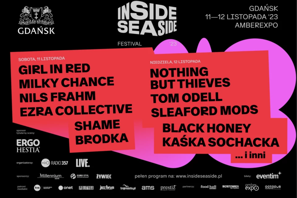 Świeżo po wydaniu swojego czwartego albumu „Dead Club City” na Inside Seaside przyjedzie rockowy kwintet NOTHING BUT THIEVES. Drugim headlinerem, który zagra na Gdańsk Stage będzie TOM ODELL, który minimalistyczne piosenki z ostatniego płyty „Best Day Of My Life” zaprezentuje w koncertowej odsłonie. Do Gdańska zawita czołówka współczesnej sceny post-punkowej: kontestacyjni SLEAFORD MODS, których koncerty pozbawione wszelkich ornamentów są niezwykłym muzycznym doświadczeniem, oraz SHAME. Obie grupy wystąpią z materiałem ze swoich tegorocznych wydawnictw.