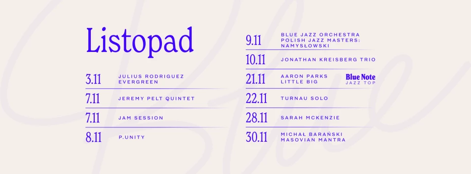 22 listopada w kameralnej odsłonie wystąpi Grzegorz Turnau (SOLD OUT), 28 listopada zagra Sarah McKenzie, a miesiąc zamknie koncert Michała Barańskiego (31.11).