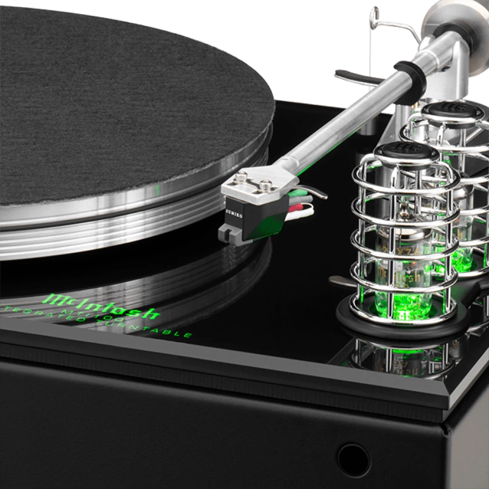 McIntosh MTI100 to gramofon z napędem pasowym 33 1/3 i 45 obr./min napędzany silnikiem synchronicznym prądu przemiennego. Wyposażony jest w aluminiowy talerz o wadze 3,18 kg, aluminiowe ramię mocowane na szklanej płycie o grubości 9,5 mm i wkładkę Sumiko Olympia - jedną z najnowszych modeli MM tej firmy. Wytrzymały aluminiowy talerz w połączeniu z metalową płytą o grubości 6,35 mm, która zwiększa stabilność, skutecznie pochłaniają hałas, który może być wywołany przez wibracje zewnętrzne.