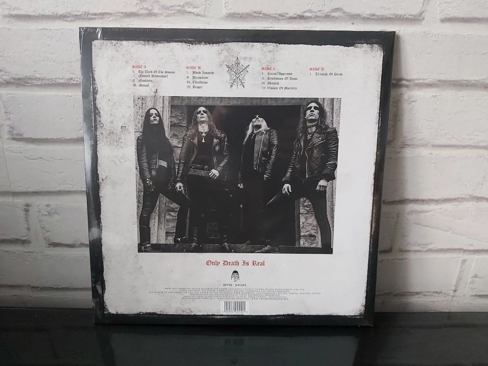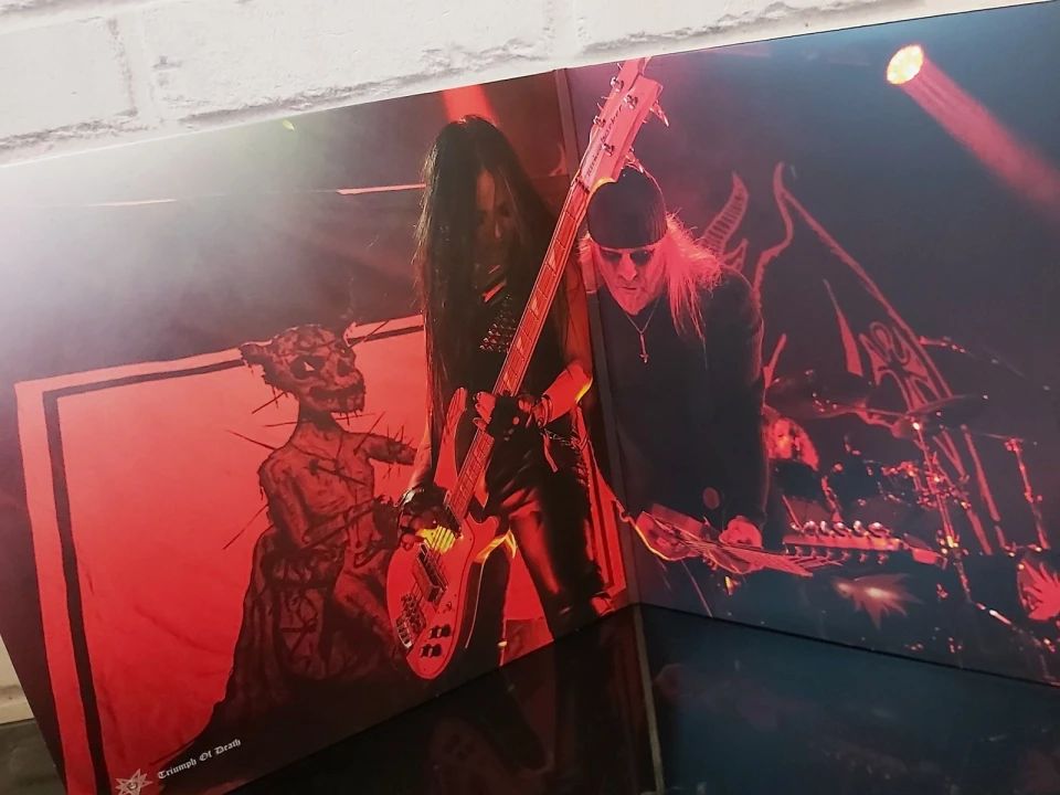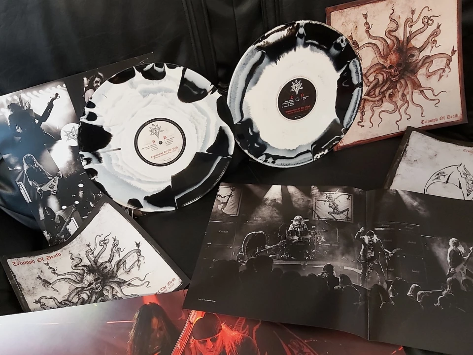 Muzyka blackmetalowa przyzwyczaiła nas do ładnych wydań, szczególnie na winylu. To, co prezentuje „Resurrection Of The Flesh: Triumph Of Death Live 2023”, moim zdaniem poszło jednak o poziom wyżej w swojej spójności - ale o tym za chwilę. Album wydany został w formie 2LP gatefold w trzech wersjach kolorystycznych: czarnym, czerwonym (z dodatkowym 7’ singlem) i czarno-białym swirl, które to mam przyjemność recenzować i pod kątem mojego gustu poleciłbym najbardziej.