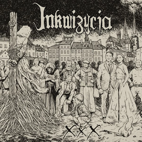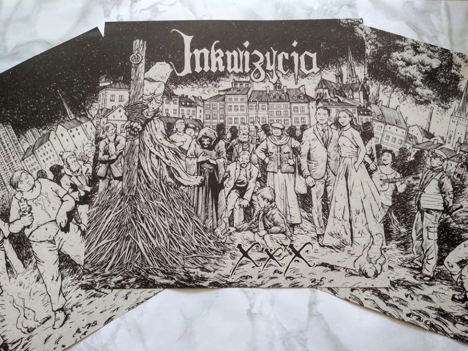 Jestem fanem kolorowych winyli. Kiedy mam możliwość wyboru, zawsze stawiam na inny niż czarny. A jeśli jeszcze mam możliwość większego urozmaicenia w postaci splatterów, dwukolorowych czy też marmurków, to dla mnie kompletny zawrót głowy. XXX Inkwizycji dostępna jest w kolorze czarnym oraz limitowanym białym. Cieszę się, że przyszło mi dzierżyć właśnie czarny kolor, który chyba najlepiej oddaje klimat płyty. Natomiast okładka zapiera dech - jest genialna! Rozbudowana grafika znajduje się również na dodatkowych planszach umieszczonych w środku. Ilustracjom towarzyszą teksty w dwóch językach oraz zdjęcia zespołu. Płyta została umieszczona w czarnej, papierowej kopercie, co zmusza mnie do ponownego zwrócenia uwagi na problem braku folii. Dlatego z oceny odejmuję pół gwiazdki.