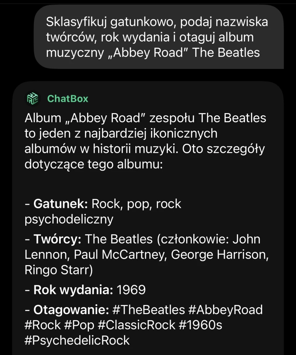 Inny przykład to sytuacja, gdy w nasze ręce wpada płyta, którą trzeba odpowiednio skatalogować. Dzieje się tak w przypadku przejmowania cudzych kolekcji lub kupowania większych zestawów zawierających albumy wcześniej nam nieznane. Wtedy jak najbardziej można wspomóc się ChatemGPT. Wystarczy wydać mu jasne polecenie, a on poda nam charakterystykę, tagi, a nawet skład osobowy danego albumu. To spore ułatwienie, w dodatku działające bez żadnych zastrzeżeń i błędów. Do zobrazowania tej funkcji posłużyłem się Beatlesami, ale AI jest w stanie sobie poradzić również z niszowymi artystami oraz bardziej unikatowymi wydawnictwami.