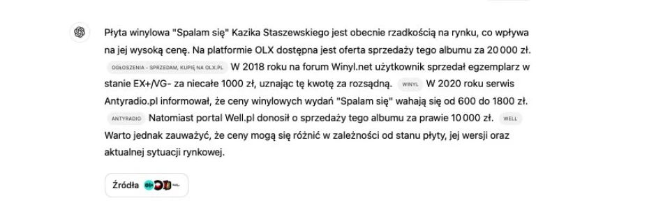 Cóż, w przypadku sztucznej inteligencji odpowiedź typu „to zależy” mnie nie satysfakcjonuje. Poza tym w drugim zdaniu AI ewidentnie odeszła od tematu płyty „Spalam się” i podała już średnie kwoty dotyczące różnych winyli (bo na pewno nie tego, o który spytałem), a na końcu jeszcze poradziła, że najlepiej będzie, jak sobie wszystko sprawdzę sam. Wszystko jednak zależy od stopnia zaawansowania narzędzia, bowiem powyższa informacja została wygenerowana przez podstawowy, darmowy ChatGPT. Wersje płatne są bardziej rzetelne i opierają się na konkretnych źródłach. Sami zobaczcie: