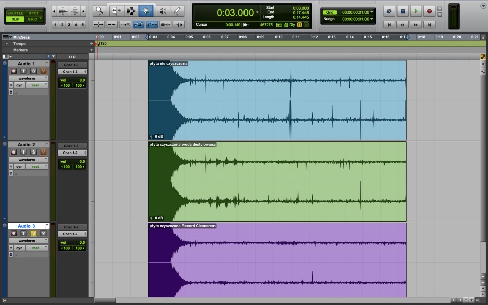 Grafika prezentuje zestawienie zapisu jakości dźwięku trzech ścieżek odtwarzanych z tej samej płyty w rożnych stanach czystości. Ścieżka 1 (niebieska) pochodzi z płyty przed czyszczeniem, ścieżka 2 (zielona) to płyta wyczyszczona wodą destylowaną, a ścieżka 3 (fioletowa) przedstawia nagranie dźwięku z płyty wyczyszczonej płynem. Im większe wychylenia skali, tym dźwięk bardziej zniekształcony poprzez obecność zabrudzeń na powierzchni płyty.