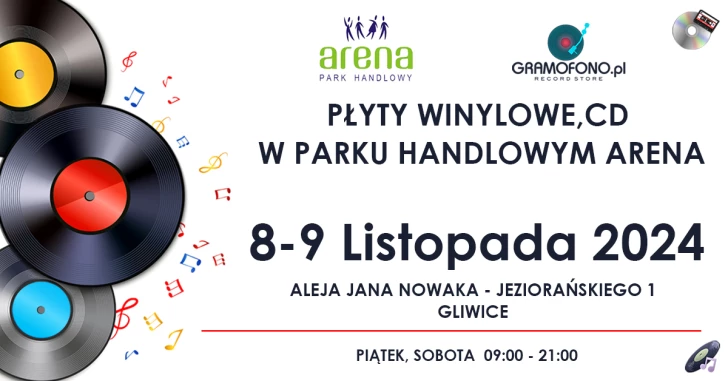 Zapraszamy wszystkich fanów płyt winylowych, CD oraz kaset na Kiermasz Płytowy, który odbędzie się w Parku Handlowym Arena Gliwice na pasażu przy wejściu głównym od strony Neonet. Pasjonaci muzyki zapewnią Państwu tysiące płyt w każdym gatunku muzycznym. Chcesz nabyć rzadkie tytuły do swojej kolekcji lub zrobić komuś prezent? Nie może Cię tam zabraknąć 8/9 LISTOPADA (PT/SOB) -C.H. Arena (Aleja Jana Nowaka Jeziorańskiego, przy trasie 88) Pasaż główny- (wejście od strony Neonet)