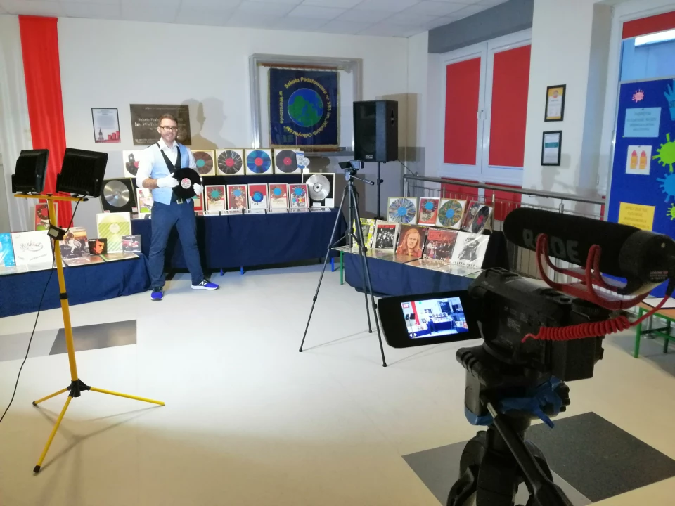Raz np. wzięliśmy na warsztat stary teledysk Czerwonych Gitar do piosenki „Kwiaty we włosach”. Ten, w którym muzycy przekładali szpule z taśmami w wielkim magazynie. Najpierw opowiadałem dzieciakom o samym zespole, pokazywałem płyty, puszczałem piosenki, a następnie wspólnie odtworzyliśmy ww. teledysk. Korespondowałem nawet z Sewerynem Krajewskim, by móc ustalić dokładne okoliczności jego powstania. Wybraliśmy się do Wytwórni Filmów Dokumentalnych i Fabularnych przy ul. Chełmskiej w Warszawie. Wcześniej ćwiczyliśmy całość w naszej szkolnej bibliotece, by zminimalizować ilość dubli i zamiast aluminiowych szpul uczniowie przenosili książki. Zaangażowali się w to również rodzice, którzy pomogli dzieciom stworzyć choreografię. Dopiero na miejscu ówczesny kierownik zespołu przechowywania zbiorów, pan Marcin Dziubiński podpowiedział nam, że teledysk musiał być kręcony w archiwach Polskich Nagrań, bo regały z półkami na oryginalnym teledysku przebiegają wzdłuż, a WFDiF posiada inny rozstaw. Niemniej jednak dopięliśmy swego, a zwieńczeniem tego projektu była nasza wspólna realizacja klipu, w którym uczniowie wcielili się w prawdziwych muzyków Czerwonych Gitar, ja poczułem się jak prawdziwy reżyser, a jeden z rodziców przez cały czas kręcenia kamerą podtrzymywał stojak z oświetleniem. Realizacja na miarę szkolnego Oscara :)