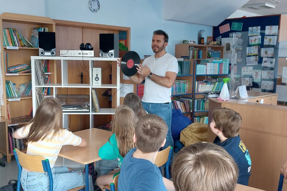 Pamiętam jak dziś, to był jeszcze okres pandemii. Pozamykano szkoły, aczkolwiek był moment, w którym zerówki u nas jeszcze stacjonowały na miejscu. Zapytałem panią dyrektor, czy coś robimy z kolejnym projektem i zapadła decyzja, że tak, działamy! Proszę sobie wyobrazić – nagle wszystko stanęło, w sieci niewiele się działo, bo placówki na szybko przygotowywały się do zajęć online, sprzęt szwankował i właśnie wtedy powiedziałem uczniom: „Zapraszam was do winylowego świata”. Ze starszymi klasami łączyłem się przez internet, a do zerówek chodziłem po prostu stacjonarnie do szkoły. Kręciliśmy razem filmiki, poznawaliśmy polską kulturę, przynosiłem im np. płyty z tańcami ludowymi, dziewczyny układały do nich choreografię w formie własnej improwizacji itd. Stare winyle znane są też z tego, że na okładkach lub labelach mają tłumaczenia w języku angielskim i to się fajnie sprawdziło, bo każdemu dawałem po płycie odkrywając znaczenie poszczególnych słów. To był strzał w dziesiątkę. Nawet po pandemii kontynuowałem te zajęcia, już ze starszymi dzieciakami. Uczyliśmy się anglojęzycznych piosenek, np. „Yellow Submarine” Beatlesów, tworzyliśmy własną żółtą łódź podwodną, a przy okazji opowiadałem im o tym zespole. Na płytach wyszło również mnóstwo baśni i legend, więc też zrobiliśmy sobie taką lekcję w ciszy, podczas której po prostu leżeliśmy i słuchaliśmy. Mierzyliśmy płyty, bo przynosiłem im je w różnych rozmiarach. A na tym przykładzie można przecież również wytłumaczyć przejście z centymetrów na cale… To wyzwanie dla klas starszych, a co dopiero mówić o klasach najmłodszych, niemniej jednak już na etapie przedszkolnym i wczesnoszkolnym uczeń dowiaduje się, że jest taka jednostka jak cal. I to wystarczy. Nic więcej. Pamiętam również, że bawiliśmy się w sklep kupując winyle na podstawie starych cen, które są z tyłu okładek. Naprawdę pomysłów nie brakuje. Winylowe zajęcia można mnożyć i mnożyć.